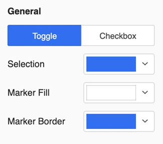 In the General format area, click Toggle. Select the colors for Selection, Marker Fill, and Marker Border for the toggle.
