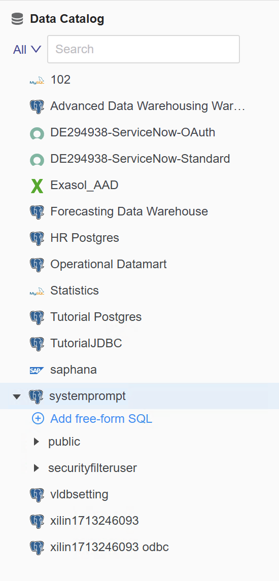 In the Schema Editor, use the Data Catalog on the left to connect to data sources and retrieve warehouse tables.