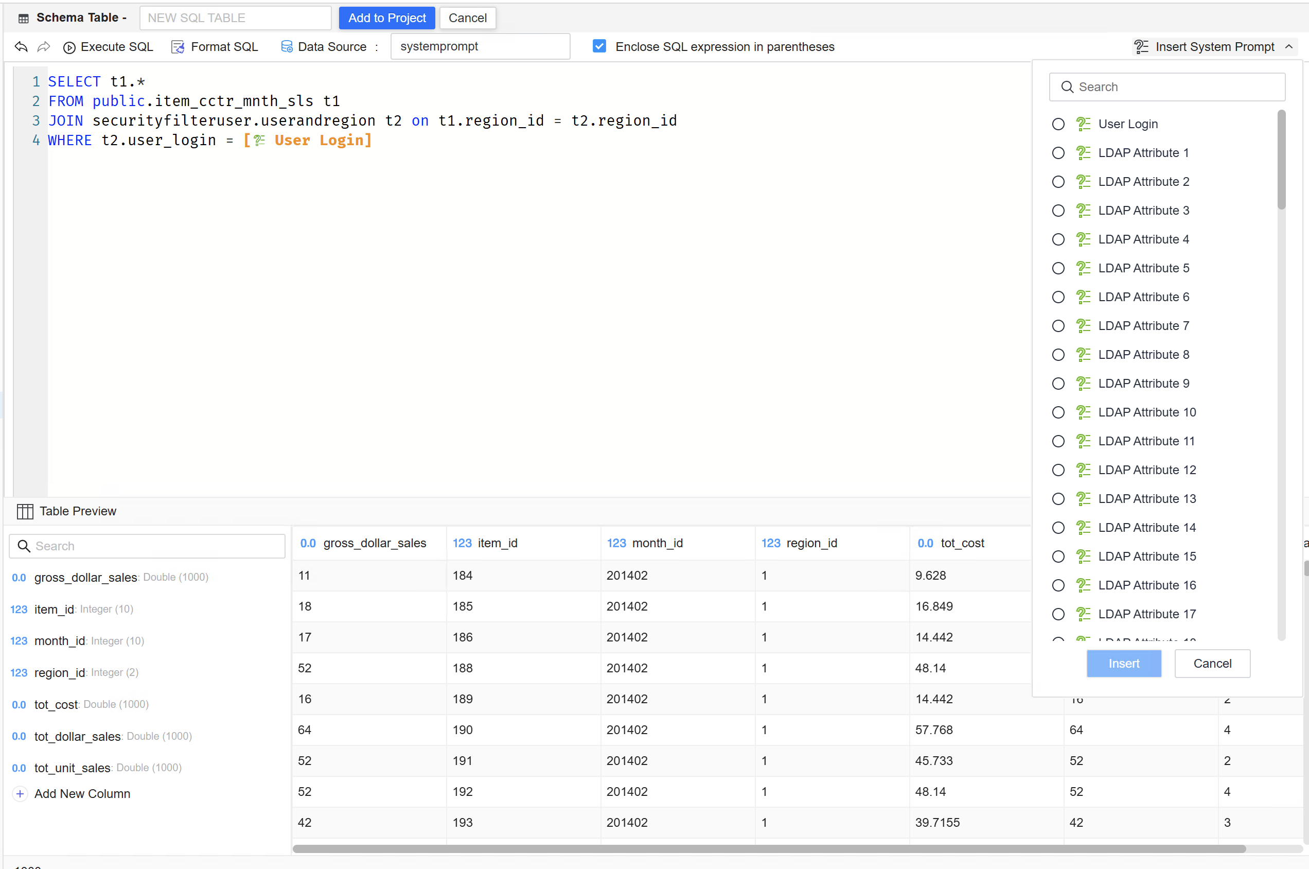 You can create logical tables with system prompts using Freeform SQL and the Schema Editor. The Schema Editor uses the Modeling service infrastructure. Make sure the service is properly configured and running before creating tables. Executing OLAP Cubes for schema objects using the system prompt is not currently supported.