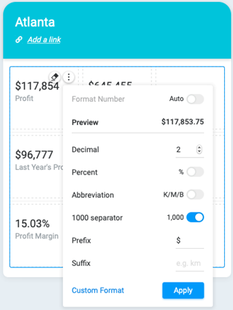 1000 separator Use the toggle to enable or disable the display of separators (e.g., commas, spaces, periods, etc.) for groups of thousands Prefix Enter characters that precede your metric value Suffix Enter characters that follow after your metric value -