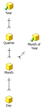 This hierarchical grouping of related business attributes is useful for analyzing data in a reporting project. For example, the sales data is stored in the data source on a daily basis. But what if you want to see a report showing monthly sales data? Because Day and Month are part of the same hierarchy, you can simply drill from the daily sales data displayed on the report, up to monthly sales data. The new report you drill to (which contains monthly sales data) is recalculated automatically based on the drilling path you select. "Drilling up" reflects the direction you are drilling into the data in relation to where the attribute exists within the hierarchy: you drill from Day (shown on the report) up the Time hierarchy to Month (which appears on the new, drilled-to report).