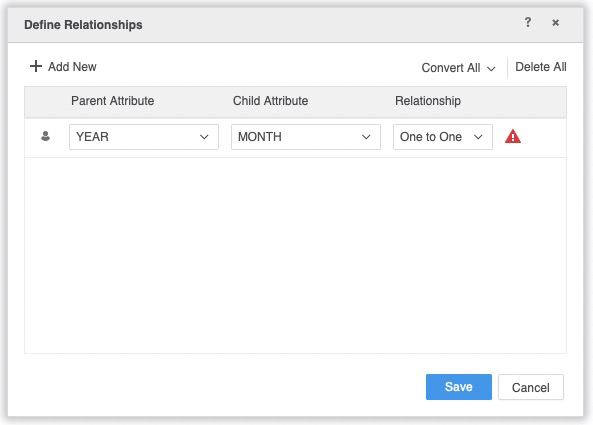 Dans cet exemple, la relation un-à-un entre ANNÉE et MOIS n'est pas valide. Après la publication du jeu de données, une icône d'erreur apparaît à droite de la relation.