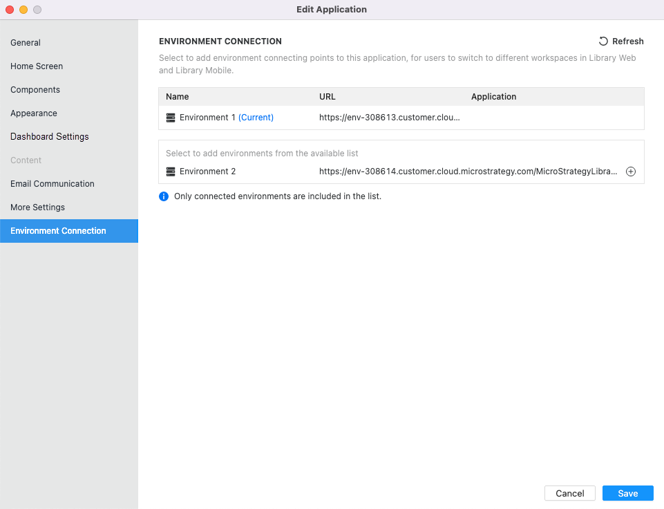 À partir de la MicroStrategy 2021 Update 9, vous pouvez activer l'accès à plusieurs environnements dans Library Web.