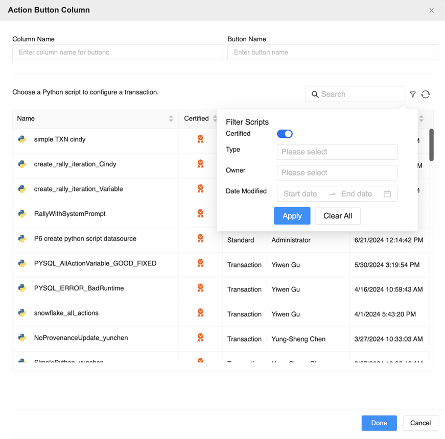 En fonction de l'action que le créateur souhaite que le bouton déclenche, vous pouvez sélectionner un script Python standard ou un script Python de transaction. Pour ces deux types de scripts, mappez les colonnes de la grille vers les variables.