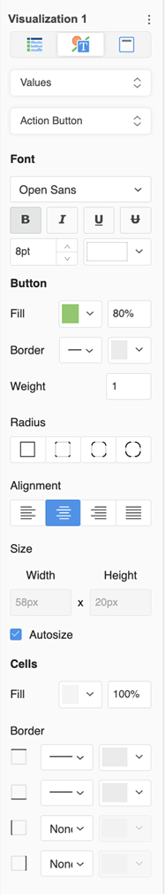Démarrage dans MicroStrategy ONE (Septembre 2024), les utilisateurs peuvent ajouter une colonne de boutons pour déclencher des actions définies dans un script Python associé pour la ligne correspondante. Avant que les utilisateurs puissent utiliser les boutons, ils doivent configuré par le créateur du tableau de bord. À l'heure actuelle, une seule colonne de bouton peut être ajoutée à une grille moderne.