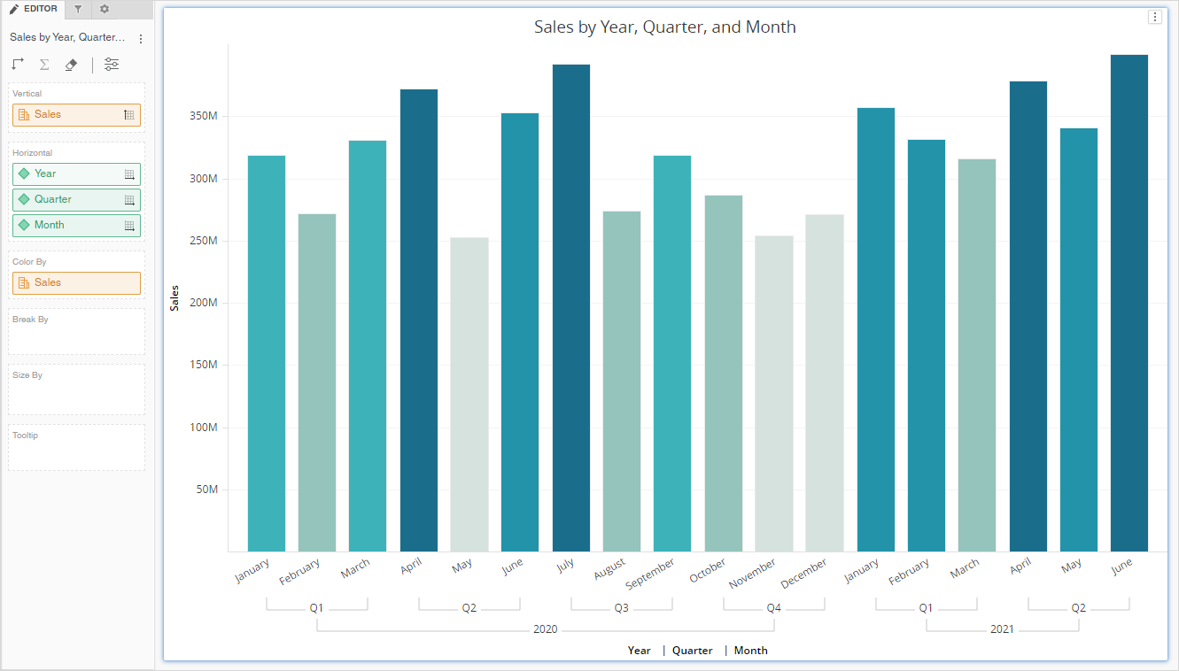 Les étiquettes d'axes imbriquées affichent les informations hiérarchiques de manière significative et facile à lire. Par exemple, les données basées sur le temps comme Année, Trimestre et Mois, ou les données géographiques comme Région et Pays bénéficient de l’imbrication ou du regroupement des sous-éléments sous le parent correspondant. Vous pouvez utiliser des étiquettes imbriquées dans les graphiques à barres, en lignes, en zone, à deux axes, à tarte, en anneau, à bulles et en dispersion.