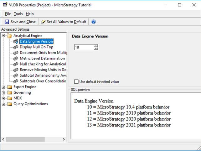 Si vous procédez à une mise à niveau à partir de MicroStrategy 2019 ou d'une version antérieure, vous remarquerez peut-être que la version du moteur de données est 2020 pour tous les projets dans votre environnement après une mise à niveau vers Strategy ONE. Une fois le processus de mise à niveau des métadonnées terminé, la version du moteur de données peut être modifiée pour ONE sur une base de projet par projet afin que les modifications de données puissent être identifiées, évaluées et résolues tout en maintenant des performances constantes sur le reste de l'environnement. Tous les nouveaux projets par défaut sont 2021 version de moteur de données.