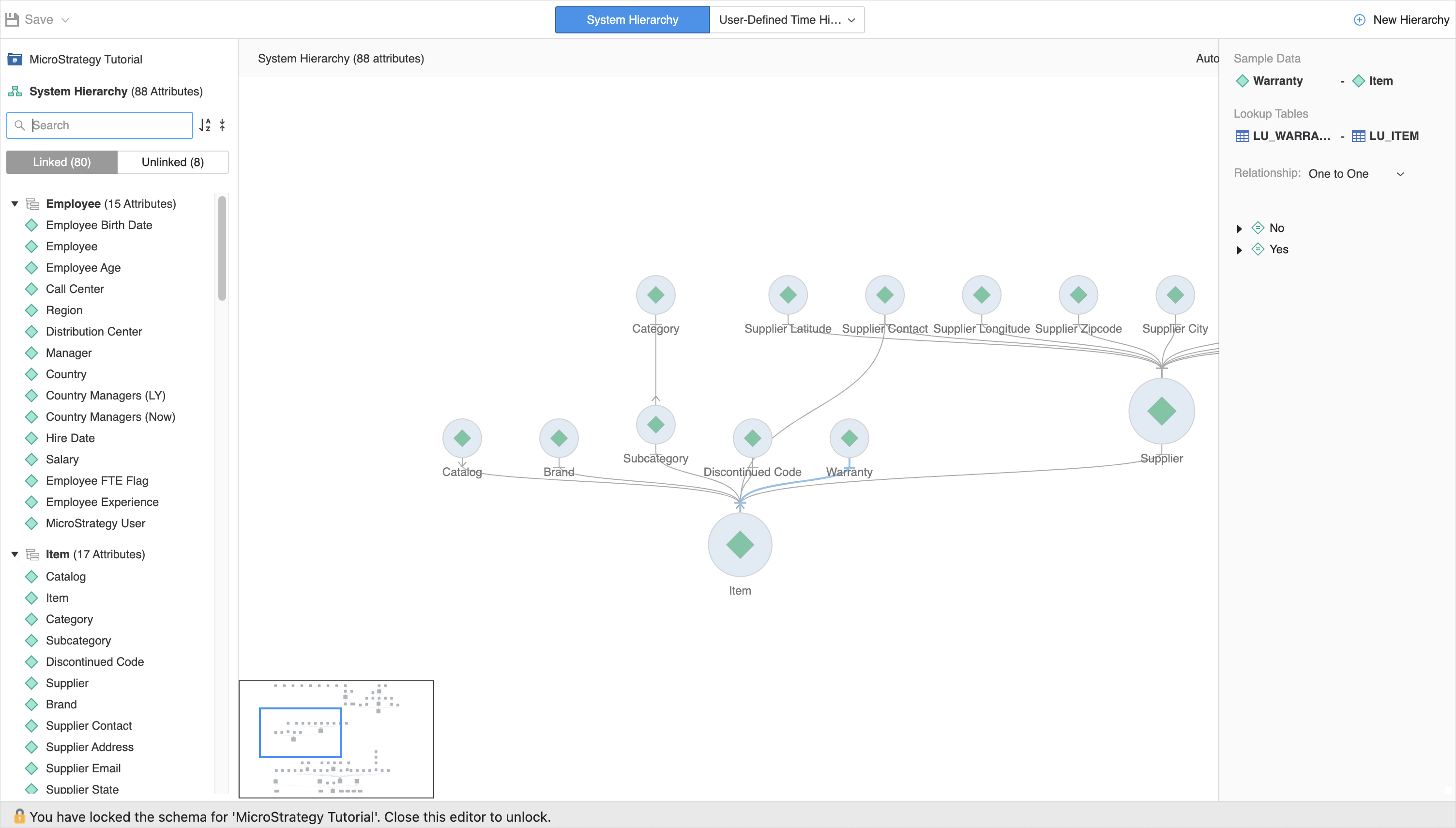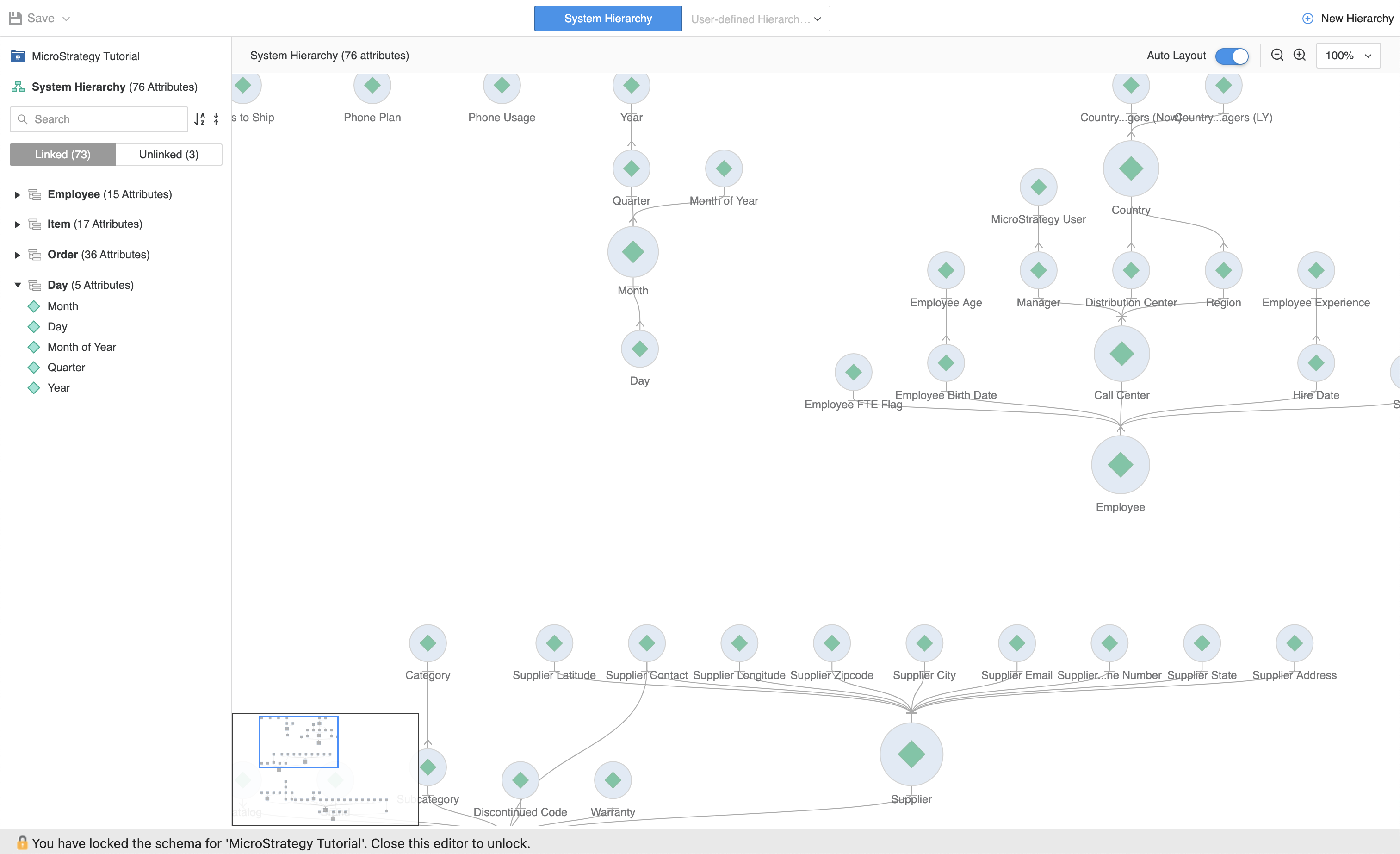 Dans une vue de hiérarchie système, cliquez sur Liés ou en Non liées pour afficher les attributs par leur statut de lien. Pour les attributs liés, il y a plusieurs groupes, nommés par les attributs racines et le nombre de leurs attributs connexes, par exemple, Jour (5 attributs).
