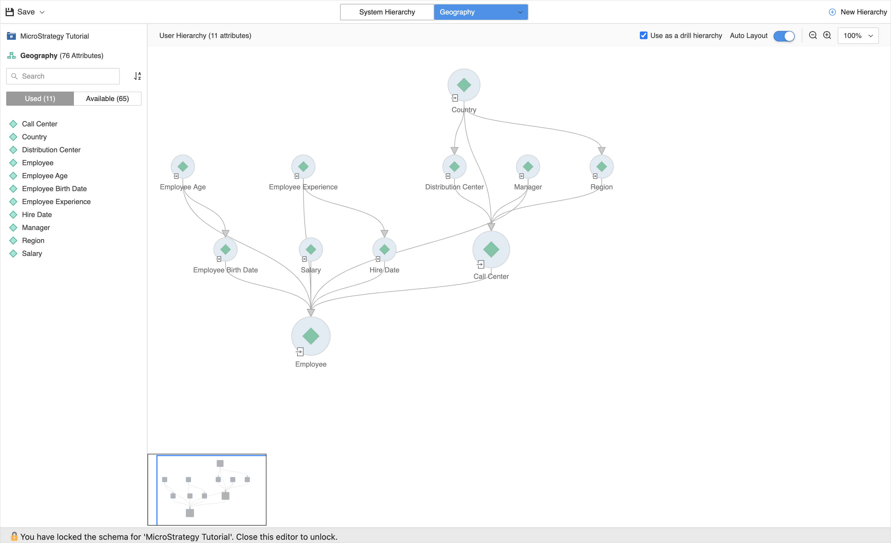 Glissez en utilisant le sélecteur en bas à gauche pour parcourir la hiérarchie. Vous pouvez également faire glisser directement dans la vue de hiérarchie. Utiliser Mise en page automatique curseur, ainsi que les options Zoom, pour organiser l'affichage à votre guise.