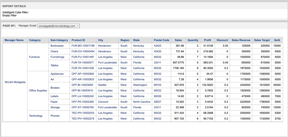 Examinez un exemple où vous devez programmer un rapport des ventes pour tous les responsables de magasin de votre organisation. Ajoutez l'attribut d'e-mail de vos responsables de magasin sur la section par page du rapport pour diviser les données par magasin. Créez une souscription d'e-mail avec l'éclatement activé, qui fournit le contenu aux magasins avec une vue de données pertinente basée sur l'attribut d'e-mail par page.