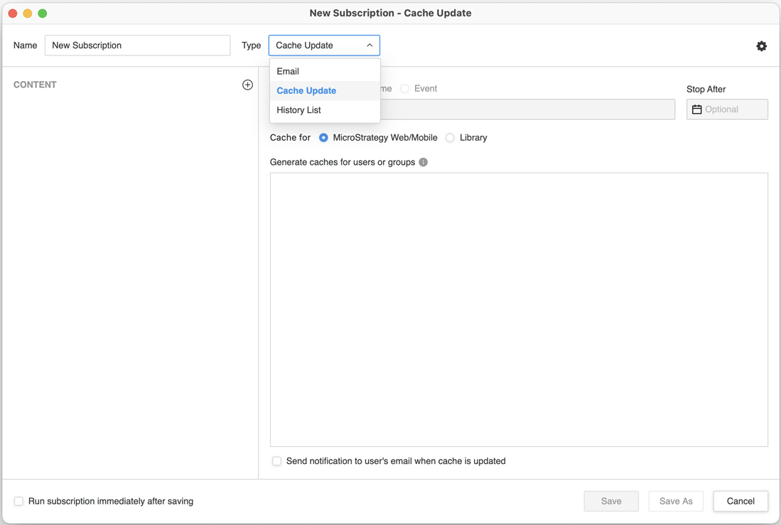 Dans Strategy Workstation, vous pouvez créer des souscriptions de cache via Distribution Services. Cette souscription permet un rapport