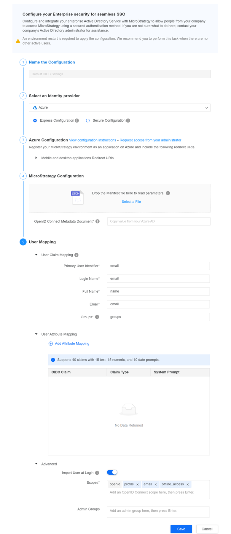 Démarrage dans MicroStrategy ONE (Décembre 2024), vous pouvez ajouter un mappage d'invite système et des groupes imbriqués à votre OIDC authentification. Cette personnalisation supplémentaire fournit un contrôle plus granulaire sur l'accès utilisateur et améliore la sécurité générale et la convivialité de votre système.