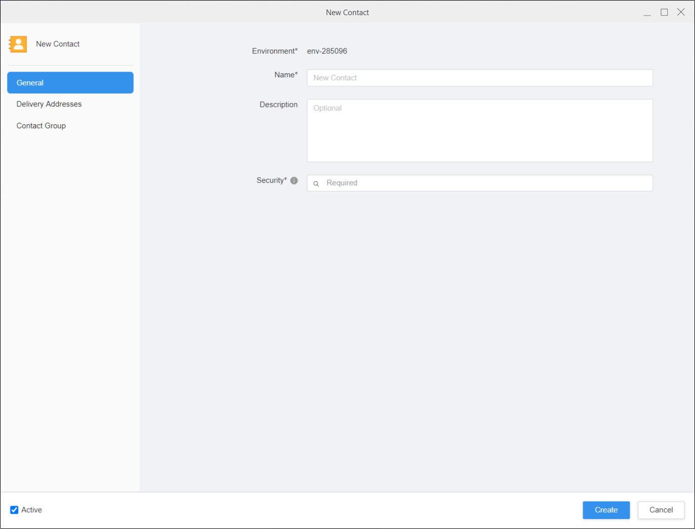 . GénéralSaisissez le nom et la description du groupe de contacts. La sécurité pour un contact est définie par le compte d'utilisateur qui est lié au contact. La sécurité de l'utilisateur est appliquée au contact pour tous les projets.
