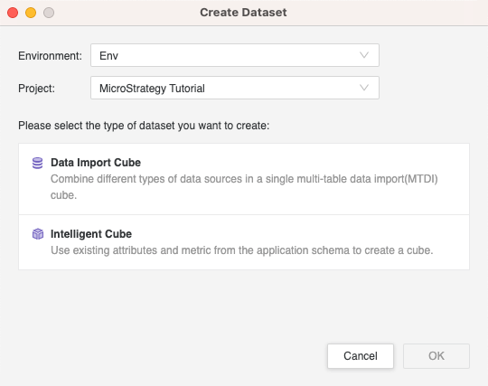 Créez un jeu de données à l'aide de Cube d'importation de données option.
