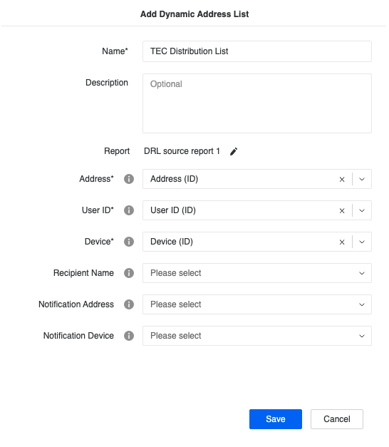 - Choisissez un Rapport et saisissez a Nom et Description pour la liste d'adresses dynamiques.
