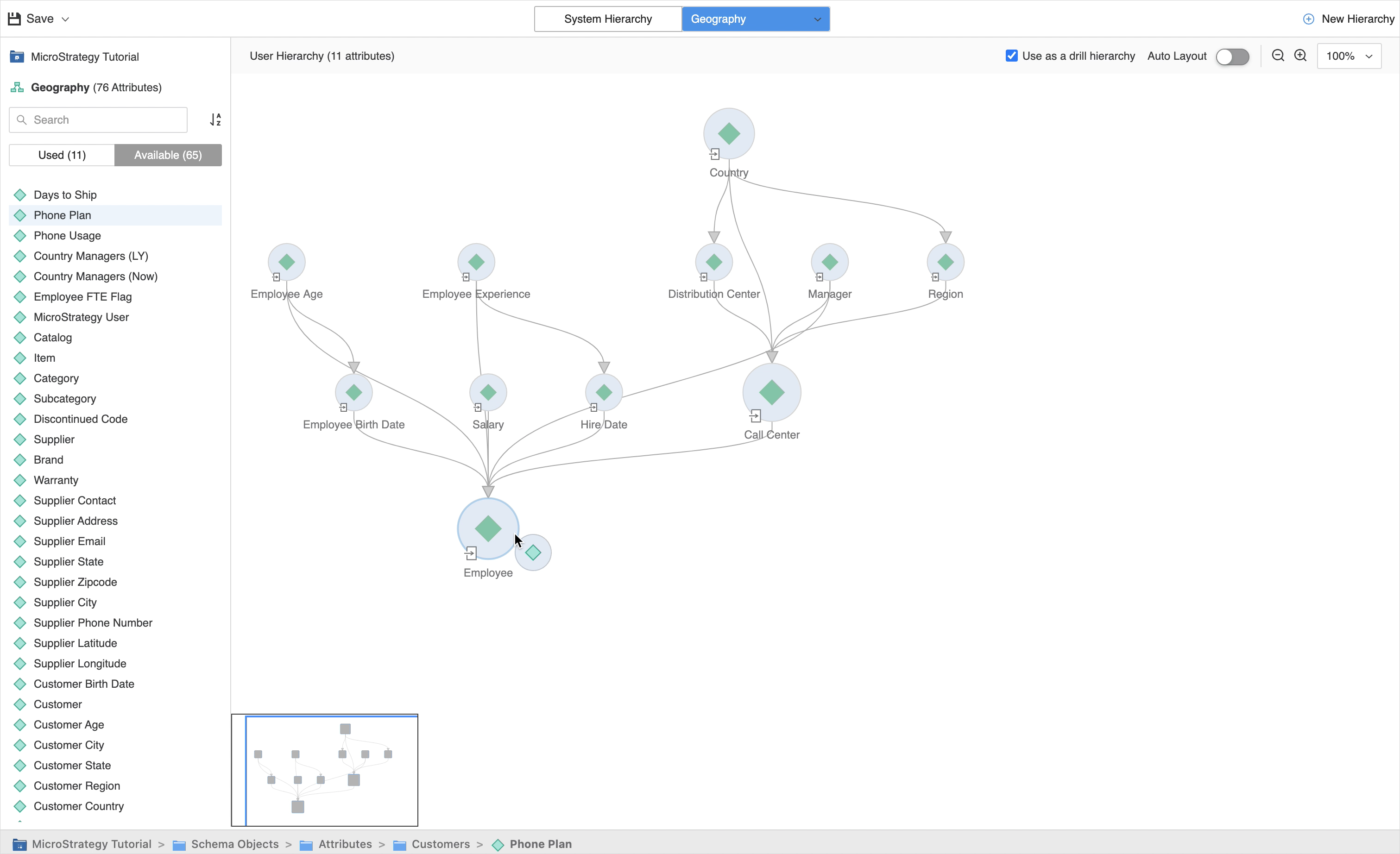 Glisser l'attribut depuis le volet gauche et le placer sur l'attribut cible dans la vue. Par exemple, si vous souhaitez lier l'attribut disponible Plan de téléphone à Employé, faites glisser Plan de téléphone du volet gauche et faites-le glisser sur Employé dans la vue.