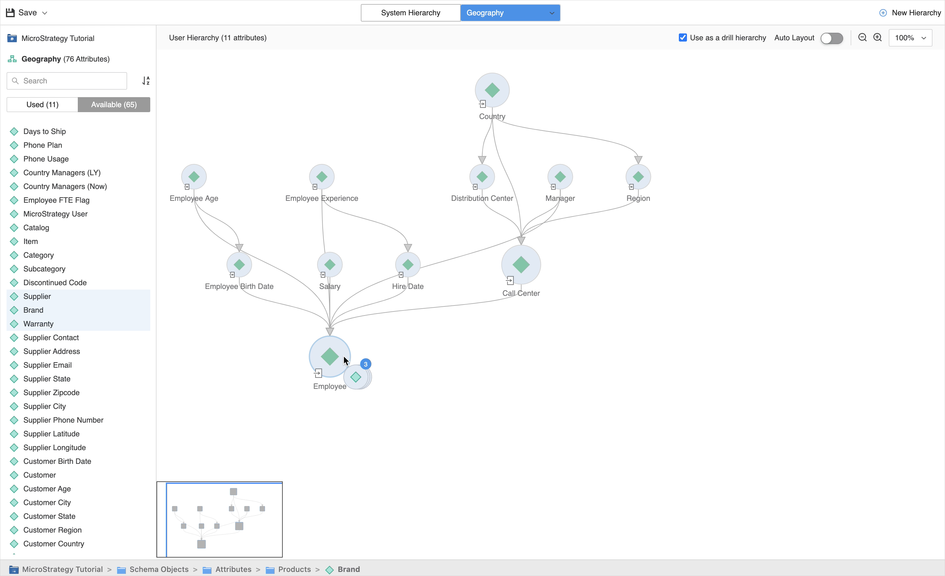 Cliquez sur l'attribut et faites glisser la bordure de l'attribut (parent) vers un autre attribut (enfant). Ces attributs sont ensuite liés par une relation parent-enfant. Vous ne pouvez pas créer de relation sur un attribut d'enfant commun, car celui-ci est en affichage seul dans l'éditeur de hiérarchies.