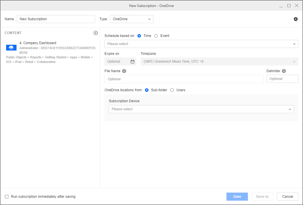 9. Dans Planification selon, choisissez parmi des objets de planification basés sur du temps ou des déclencheurs basés sur des événements. En fonction de votre environnement, vous pouvez également choisir une date d'expiration pour la souscription dans Expire le et Fuseau horaire.