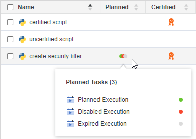 Dans la fenêtre Scripts, une colonne Planifié s'affiche. Cliquez avec le bouton droit de la souris dans la colonne Planifiée d'un script pour afficher une liste des tâches planifiées associées au script et leur statut, comme indiqué ci-dessous :