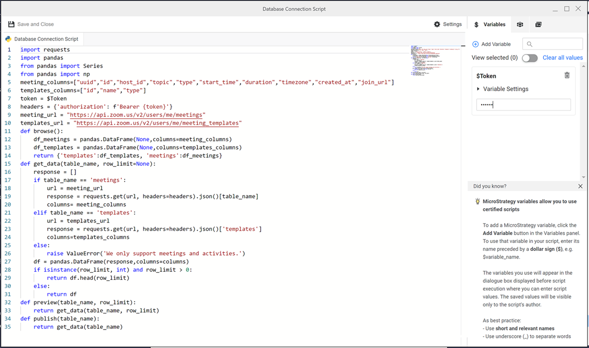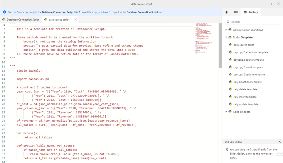 Trouvez un modèle de script pour votre script de source de données dans Galerie. Écrivez votre script Python dans le panneau de gauche pour récupérer les données de votre source de données. Pour plus d'informations, reportez-vous à Écrire un script de source de données Python.