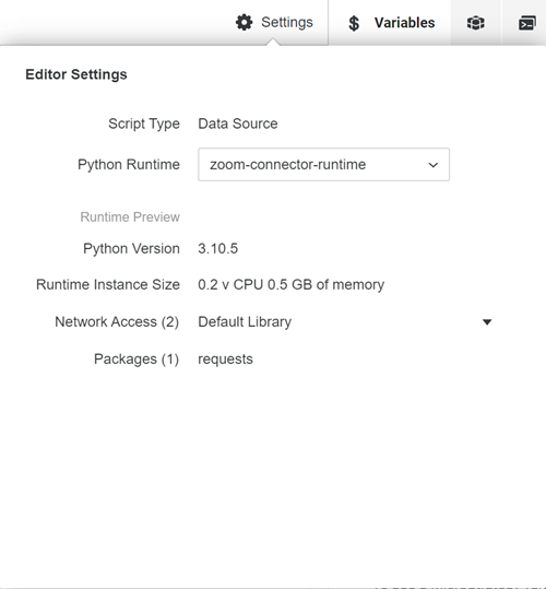 Cliquez sur Paramètres et choisissez Créer et modifier les runtimes Python pour exécuter le script de source de données Python.