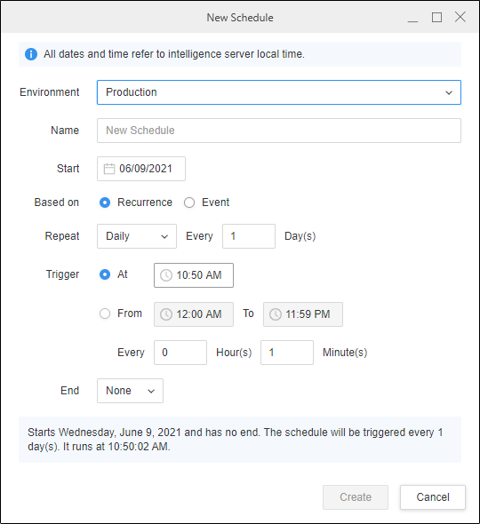 - Cliquez sur Créer pour enregistrer l'objet de planification.