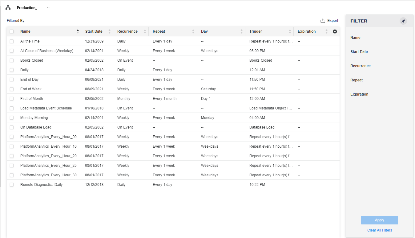 Panneau Filtre Listes Nom, Date de démarrage, Récurgence, Répéter, et Expiration. Vous pouvez effectuer plusieurs sélections à partir de ce filtre et les appliquer à la grille. Le récapitulatif du filtre apparaît en haut de la grille. Vous pouvez supprimer des éléments ou effacer toutes les sélections de filtres à partir de là.