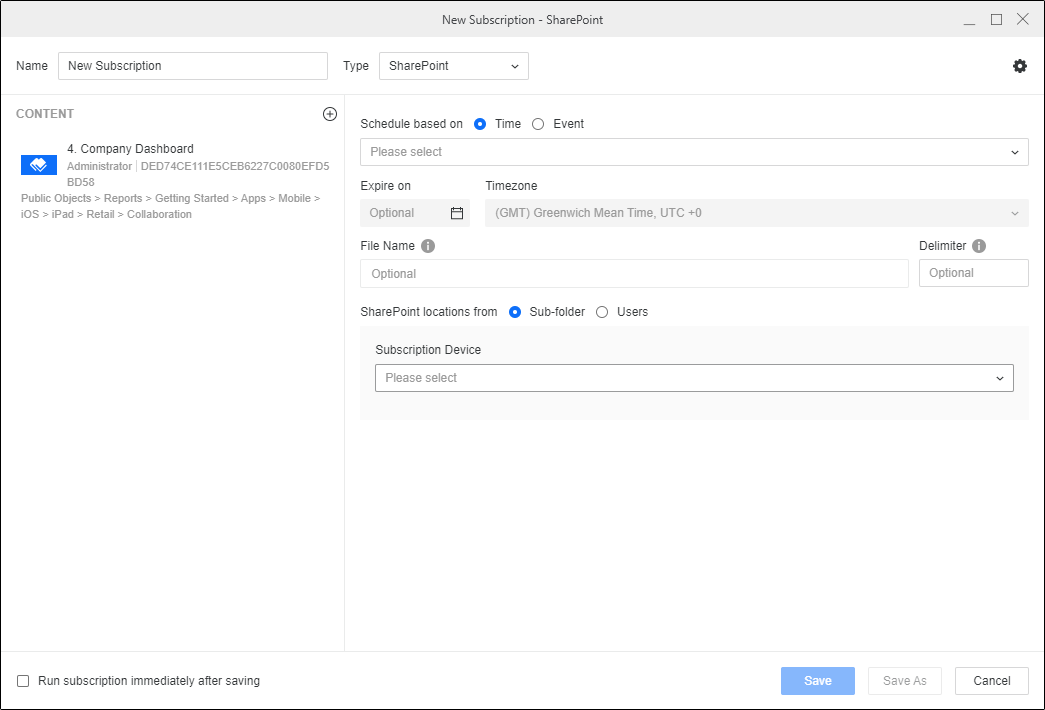 Démarrage dans Strategy One (Mars 2025), vous pouvez utiliser les souscriptions Microsoft SharePoint pour fournir des tableaux de bord, documents, ou des rapports vers votre environnement SharePoint en fonction des intervalles de temps ou des événements. Vous pouvez sélectionner un ou plusieurs dossiers, documents, ou des rapports dans divers formats, définissez une planification et un message, et indiquez les paramètres pour l'objet de souscription.