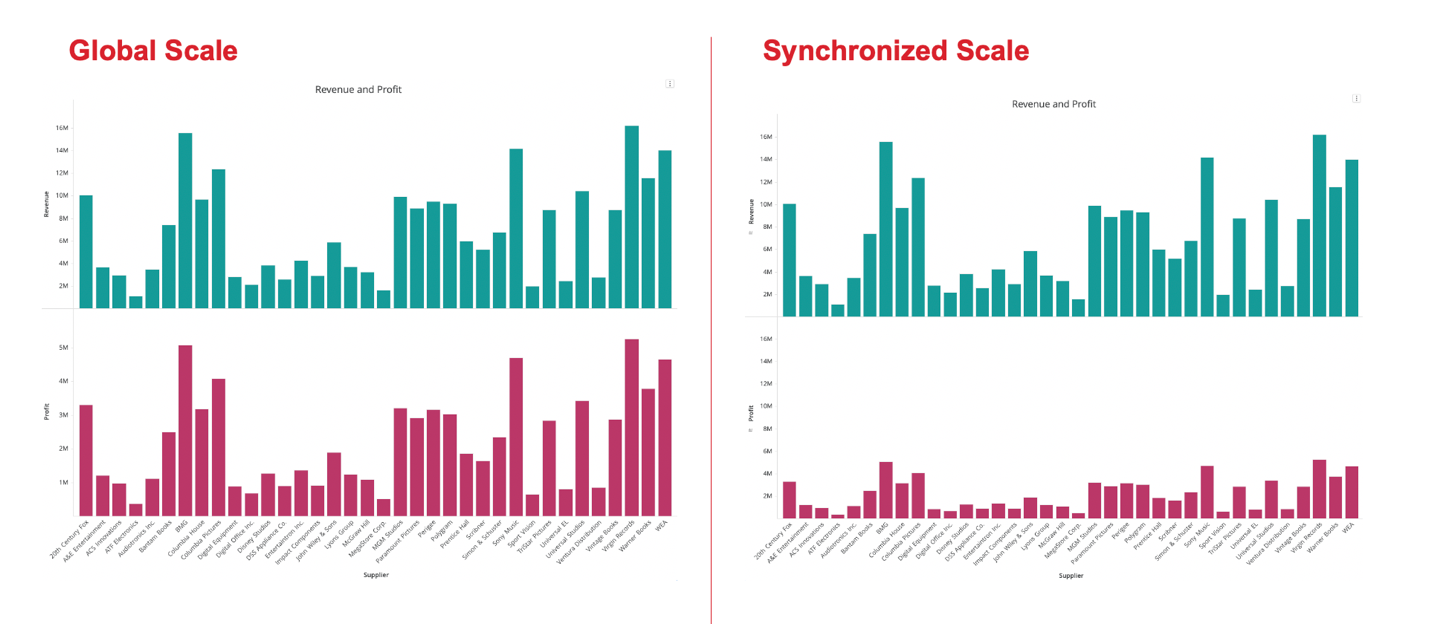 Par exemple, d'un coup d'œil rapide sur ce graphique de gauche, il semble que les recettes et les bénéfices soient presque les mêmes, ce qui est trompeur pour les utilisateurs finaux. Comme on le voit sur le graphique de droite, l'historique à barres synchronisées permet aux utilisateurs de comprendre rapidement et visuellement la véritable relation. Les utilisateurs peuvent activer cette option sur les graphiques à barres doubles existants en cliquant avec le bouton droit de la souris sur l'axe ou en modifiant le type de visualisation pour Graphe en barres à axes synchronisés.