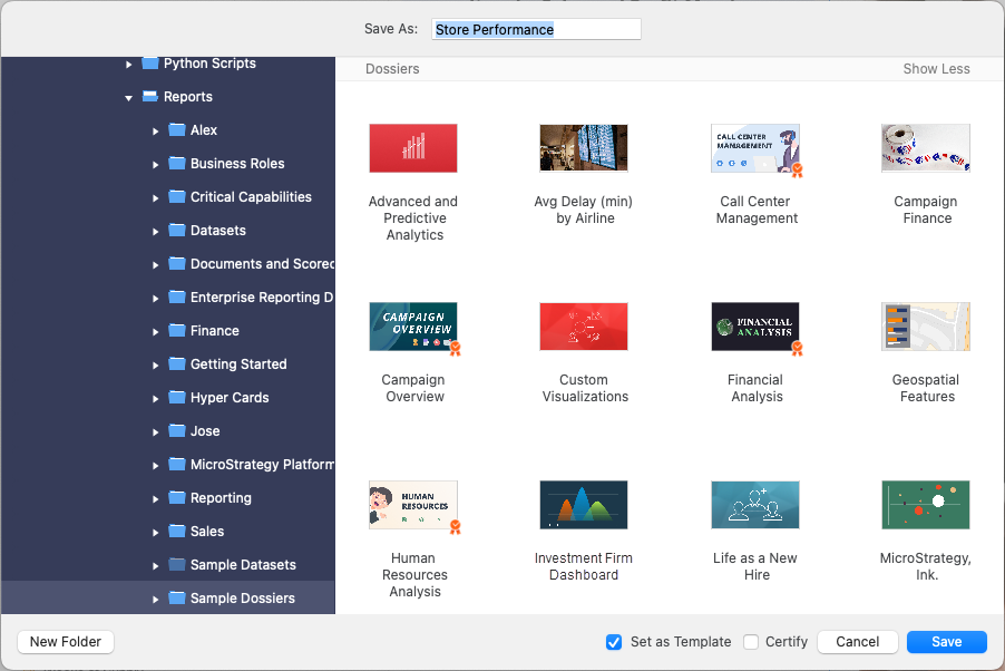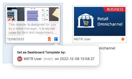 À partir de la MicroStrategy 2021 Update 8, les architectes d'application peuvent définir n'importe quel tableau de bord comme modèle. De plus, les administrateurs ou les architectes peuvent définir un modèle comme modèle par défaut pour un projet. Les modèles fournissent un point de départ aux utilisateurs pour créer du contenu. Ils peuvent contenir une mise en page prédéfinie, un logo d’entreprise, une image de couverture ou même un ou plusieurs jeux de données, guidant ainsi l’utilisateur et s’assurant qu’ils respectent les normes de l’entreprise. Lors de la création de nouveaux tableaux de bord, les utilisateurs se voient présenter une interface qui leur permet de sélectionner d'abord un jeu de données, puis de sélectionner l'un des modèles auquel ils ont accès.