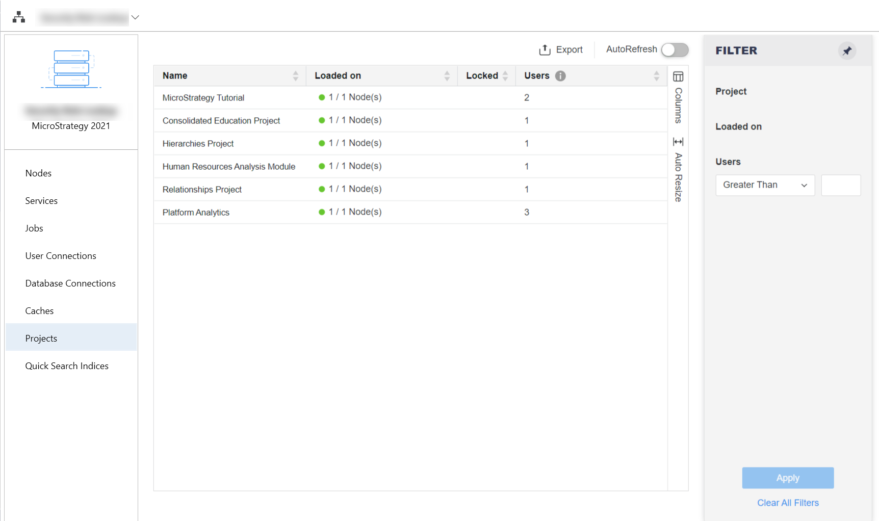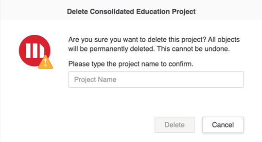 À partir de la MicroStrategy 2021 Update 8, vous pouvez supprimer des projets pour maintenir votre environnement sécurisé et scalable. Il est important de supprimer un projet lorsqu'il n'y a aucune activité de l'utilisateur et que le projet est prêt à être retiré. Une fois que vous supprimez un projet, vous pouvez maintenir votre environnement scalable en allouant des ressources à un nouveau projet ou à des projets existants. Vous pouvez uniquement supprimer les projets non chargés de Workstation pour vous assurer qu'il n'y a pas d'utilisateurs actifs ou de connexions de base de données dans le projet.