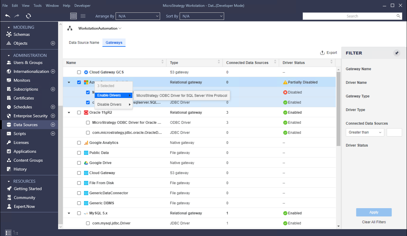 Strategy s'appuie sur les pilotes pour se connecter aux sources de données, qui fournissent des données pour l'analyse. Le panneau Passerelles permet aux administrateurs de désactiver les pilotes présentant des failles.