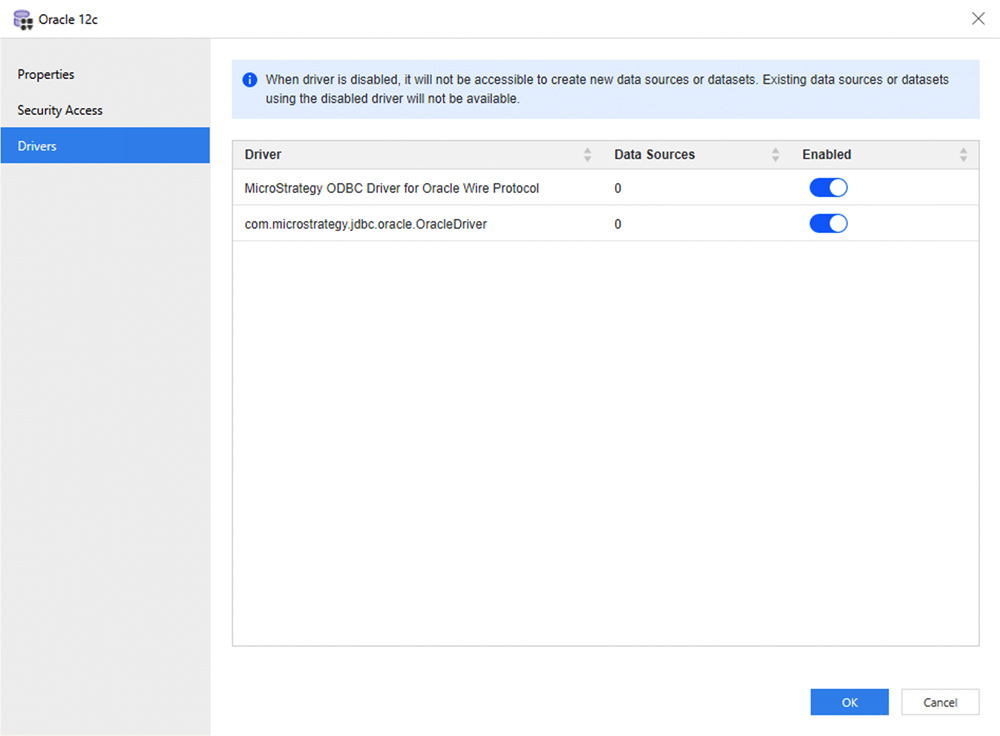 Si un utilisateur ajoute ou choisit une connexion de base de données avec un pilote désactivé dans Ajouter une source de données ou en Modifier la source de données Dans la fenêtre, un message d'avertissement apparaît pour indiquer qu'un pilote associé est désactivé. Les messages d'avertissement suivants peuvent s'afficher :