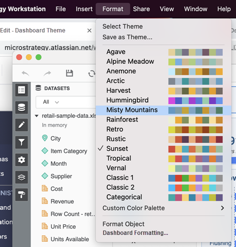 À partir de MicroStrategy ONE Update 10, les architectes d'application peuvent définir des thèmes de tableaux de bord réutilisables lors de la création de nouveaux tableaux de bord dans Workstation. Cela comprend le type de police par défaut, la taille, la palette de couleurs sur les grilles/graphiques et la couleur de remplissage, entre autres propriétés de mise en forme dans différentes visualisations et types de composants. Les utilisateurs peuvent appliquer un thème en cliquant simplement pour modifier l’apparence de leurs tableaux de bord. Cette méthode est beaucoup plus simple et efficace que de modifier la mise en forme de chaque visualisation.