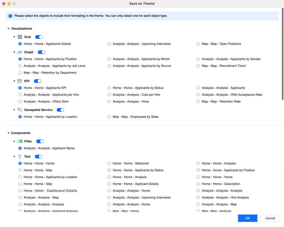 Sélectionnez des objets pour inclure leur formatage dans le thème. Vous pouvez en sélectionner seulement un par type d'objet.