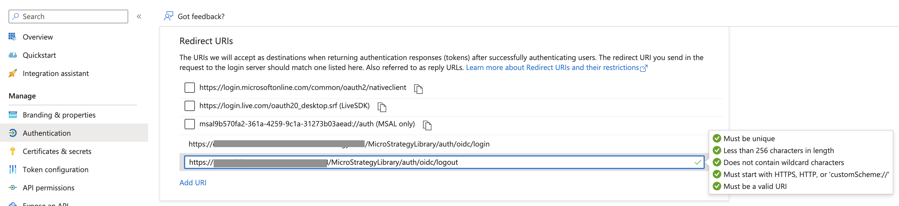 Dans la console Azure, allez sur Authentification et ajoutez l'URI de redirection de déconnexion que vous avez copié sous URI de redirection. Utiliser le format suivant :