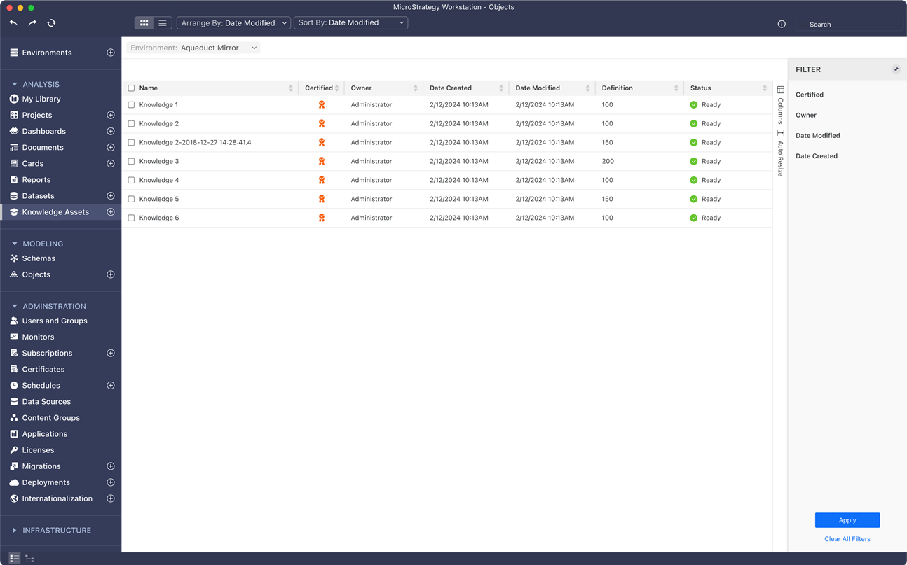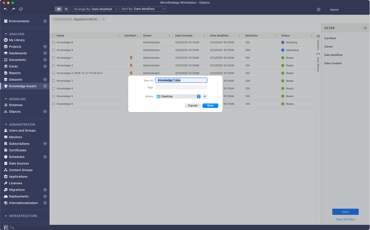 À partir de MicroStrategy ONE (juin 2024), les administrateurs peuvent utiliser Workstation pour télécharger et gérer les actifs de connaissance dans Workstation. Les administrateurs peuvent également configurer un actif de connaissances au niveau de l'application afin que cet actif puisse être utilisé dans les Bots et les tableaux de bord sous l'application.