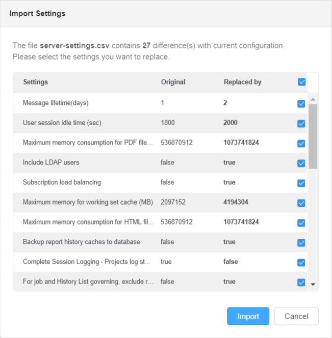Les administrateurs peuvent exporter les paramètres au niveau du serveur vers un .csv fichier et importez-les pour les utiliser avec un autre serveur.