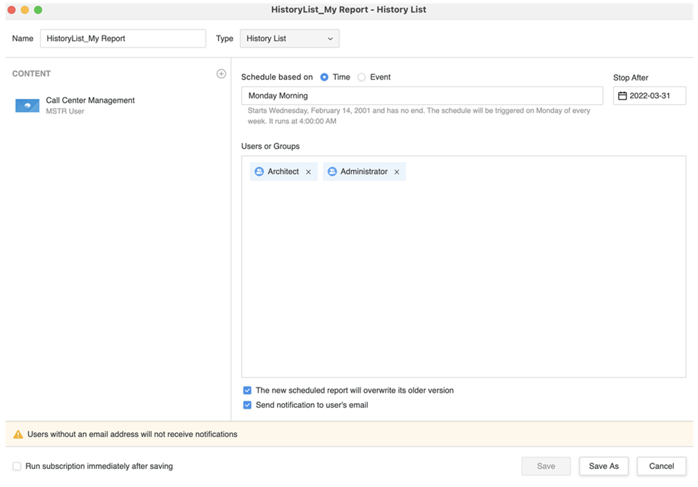 Pour envoyer une notification lorsque la souscription est exécutée et que l'historique est mis à jour, sélectionnez Envoyer une notification sur l'adresse e-mail de l'utilisateur.
