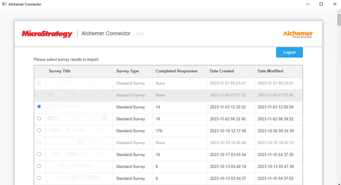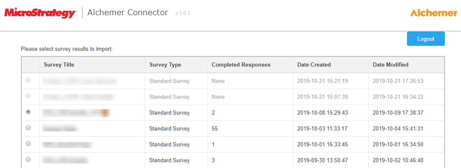 - Après une autorisation réussie, vous êtes redirigé vers une page d'importation des données qui affiche une liste de vos enquêtes.