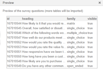- Cliquez sur Aperçu de données pour avoir un aperçu des questions contenues dans l'enquête.