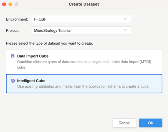 Sélectionnez l'environnement et le projet où vous souhaitez enregistrer votre Cube intelligent, sélectionnez Cube intelligent, et cliquez sur OK.