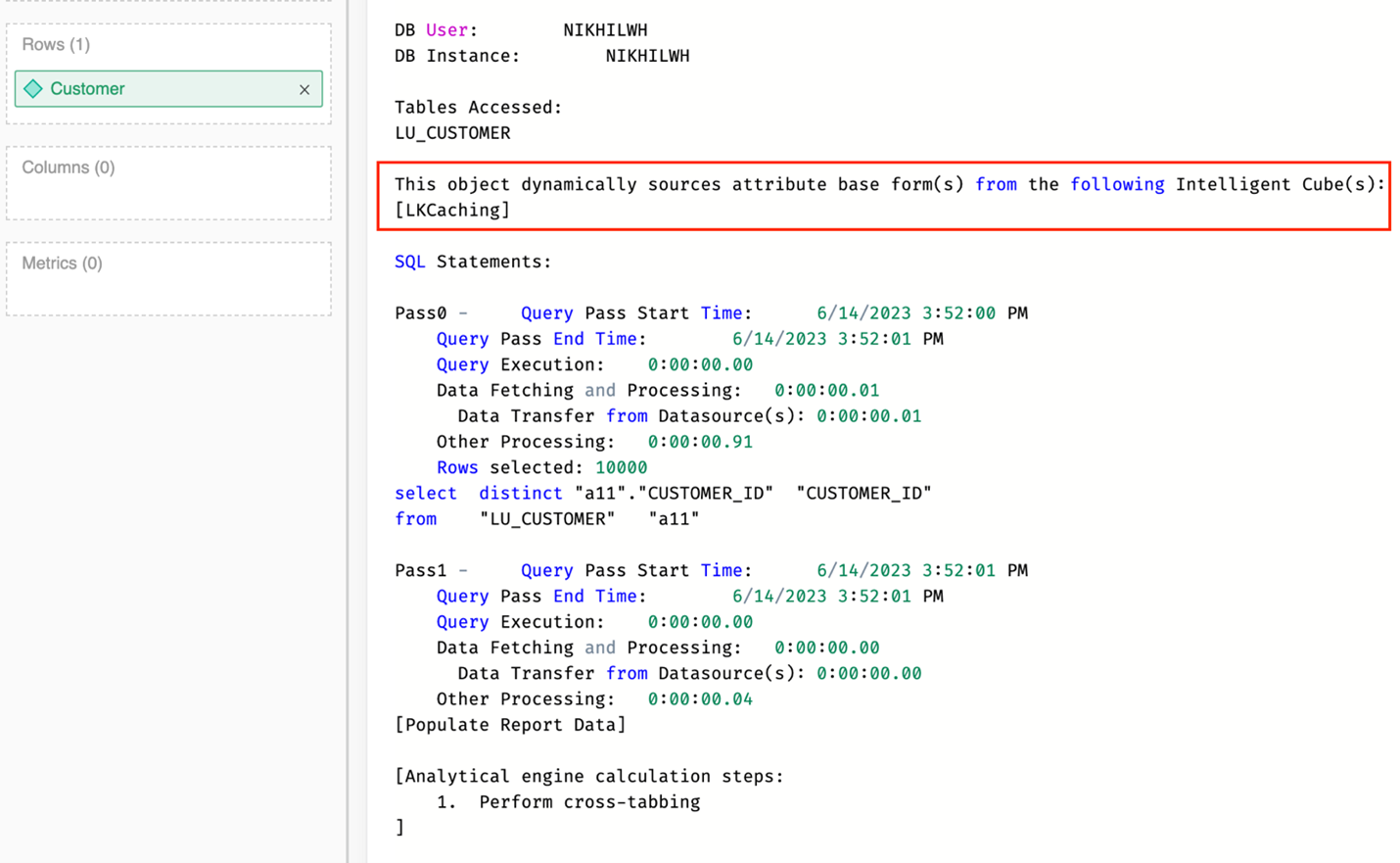 Lors de l'exécution d'un rapport normal ou de la publication d'un Cube intelligent qui inclut les formes d'attribut en cache, le message suivant s'affiche dans la vue SQL : « Cet objet puise dynamiquement les formes de base d'attribut à partir du ou des Cubes intelligents suivants : ». Seule la forme ID des attributs en cache est sélectionnée dans l'instruction SQL.