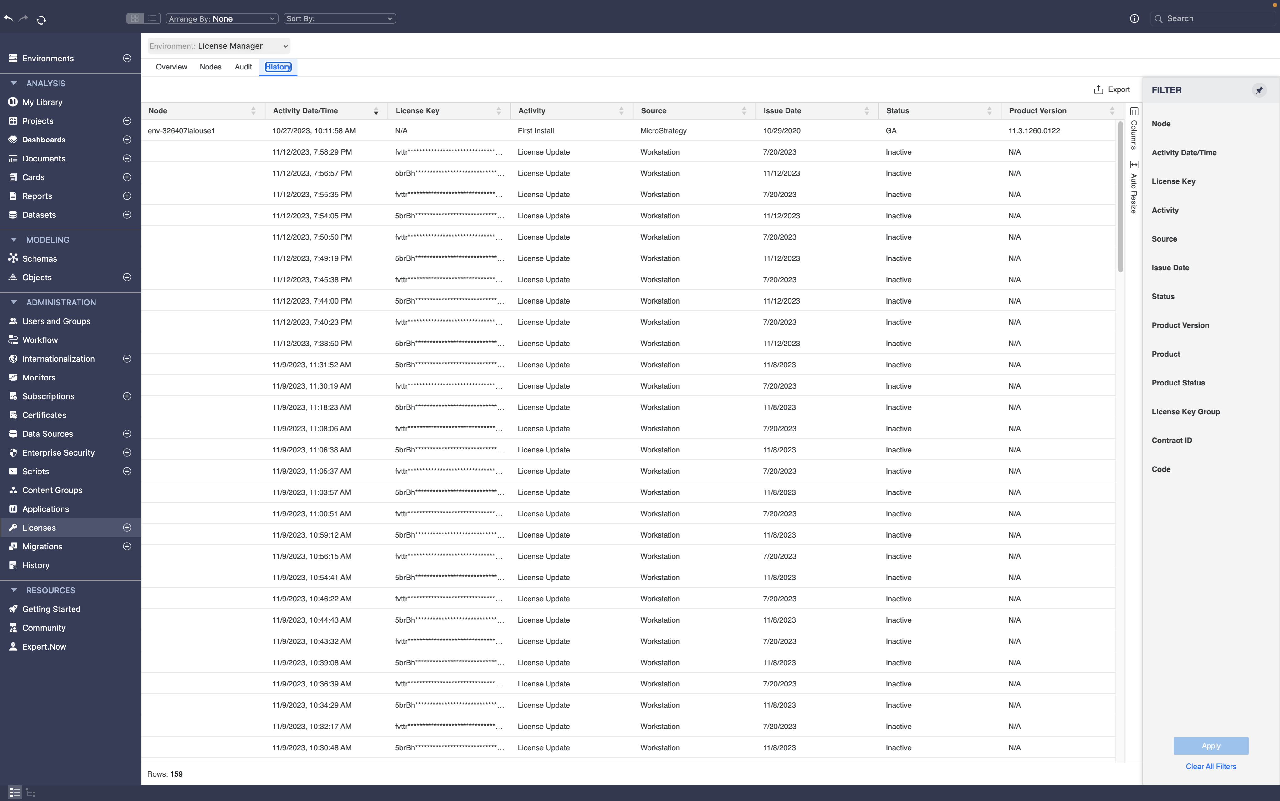 - Afficher votre Strategy One l'historique d'installation, y compris toutes les clés de licence qui ont été appliquées.
