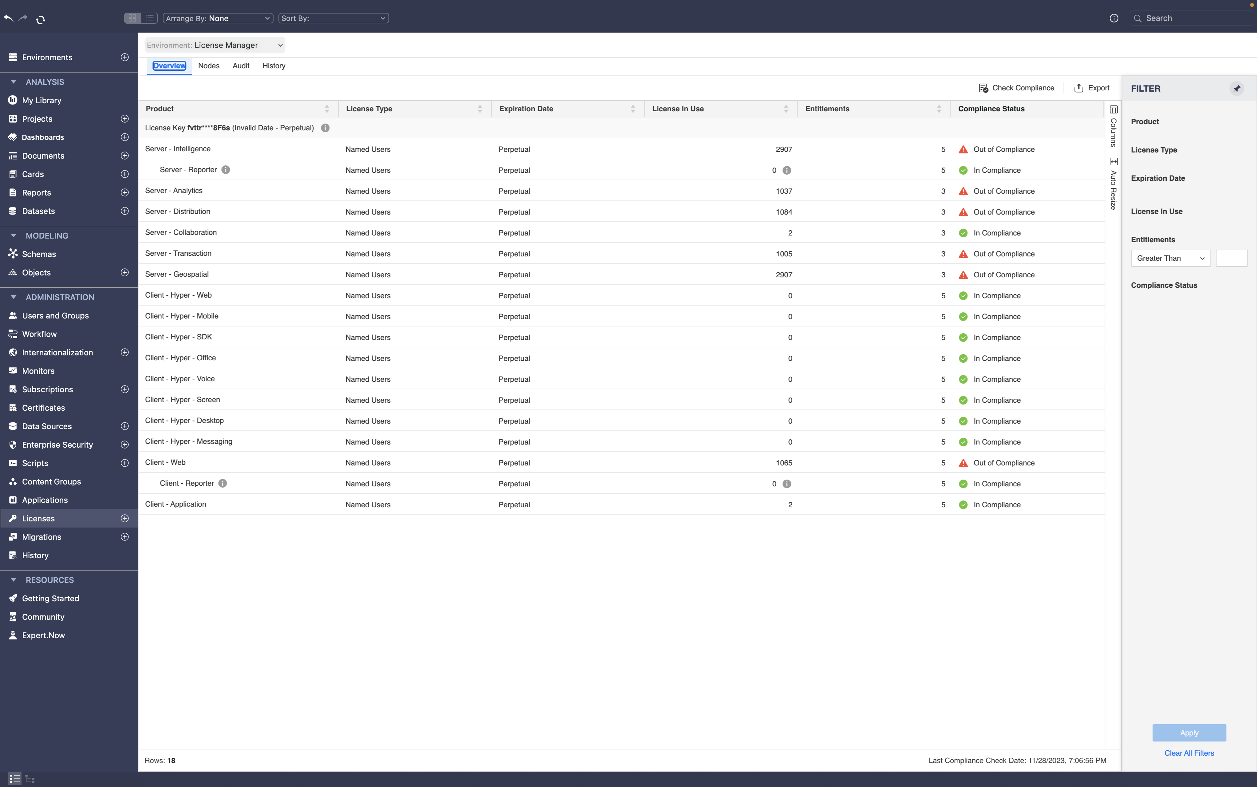Les administrateurs jouent un rôle important pour maintenir la conformité des utilisateurs et des licences matérielles affectés. Si les licences attribuées ne sont pas conformes à la Strategy One licence du produit, les utilisateurs peuvent rencontrer des problèmes lors de l'accès au produit. De plus, les produits peuvent ne pas fonctionner comme prévu.