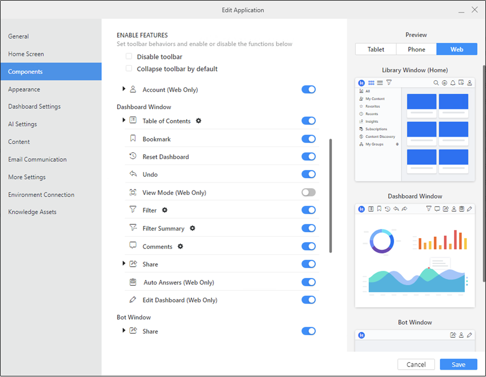 Si vous procédez à la mise à niveau vers MicroStrategy ONE (Juin 2024) à partir d'une version antérieure, si un administrateur active le composant d'application, les utilisateurs ne verront pas l'option de mode d'affichage, à moins que le paramètre au niveau du tableau de bord ne soit sélectionné.