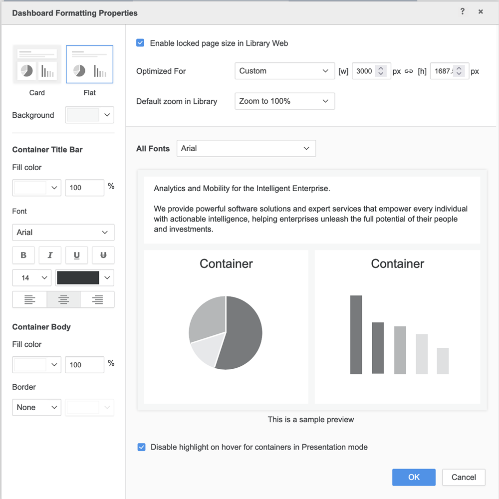 MicroStrategy ONE (Juin 2024) présente un nouveau paramètre de formatage de tableau de bord pour verrouiller la taille de la page d'un tableau de bord. Vous pouvez définir des ratios prédéfinis ou personnalisés pour que la taille du tableau de bord soit mise à jour en fonction de la modification de la taille de votre navigateur. Le rapport longueur/largeur ne change pas pour chaque composant sur le canevas.