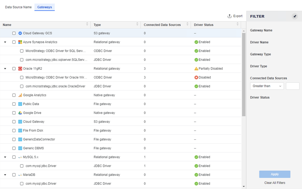 À partir de la MicroStrategy 2021 Update 9, Strategy prend en charge la gestion des passerelles et des pilotes. Les administrateurs peuvent désactiver et activer les passerelles et les pilotes depuis Workstation.