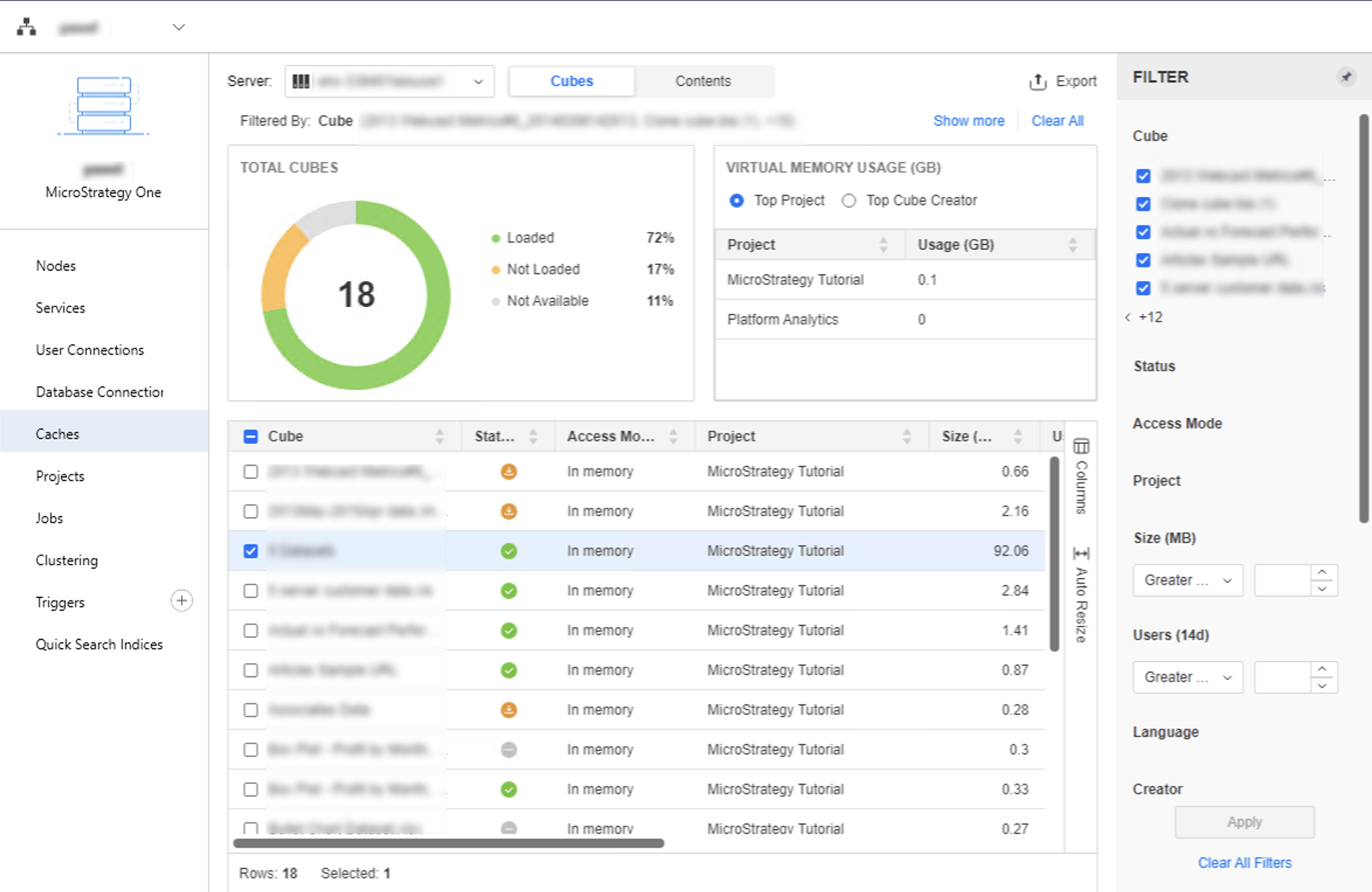 12. Cliquez sur Exporter pour enregistrer les informations de l'instance de cache dans un fichier .csv. Le fichier inclut les instances du Cube dans la grille, le filtre appliqué et la sélection de visualisation.