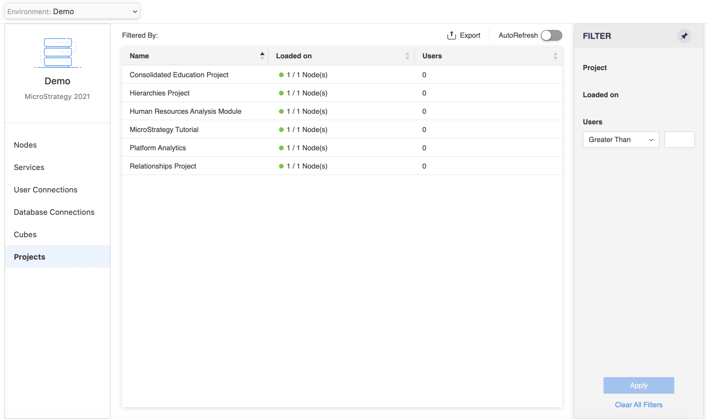 Vous pouvez afficher tous les projets sur un serveur Intelligence Server. Si vous avez le Projet Platform Analytics configuré et chargé, vous pouvez surveiller l'état du projet et afficher le nombre récent d'utilisateurs actifs des projets. Vous pouvez également charger et décharger des projets pour l'ensemble de l'environnement ou un nœud unique du cluster. En outre, vous pouvez afficher et modifier les propriétés de base au niveau du projet, afficher l'activité du projet, afficher l'accès et les rôles, modifier les quotas de stockage des jeux de données pour les utilisateurs, modifier les paramètres de cache et de Cube intelligent, modifier tous les paramètres, exporter les paramètres et les importer pour les utiliser dans un autre , afficher l'activité récente des utilisateurs et modifier les nœuds chargés du projet au démarrage du serveur.